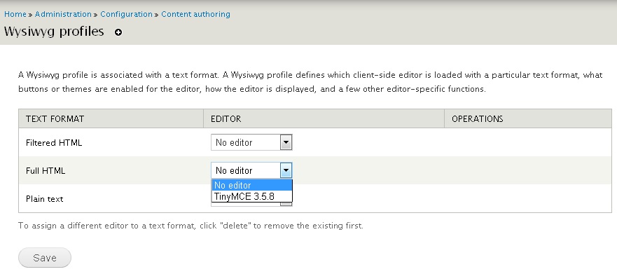 Pada halaman Wysiwyg profile juga akan terdapat text format dan pilihan editor yang bisa Anda gunakan. Pilih text editor pada salah satu atau beberapa text format yang Anda ingin gunakan. Setelah itu klik Save