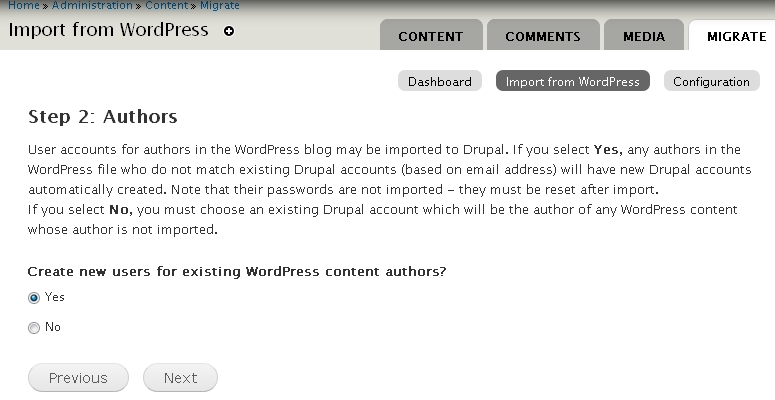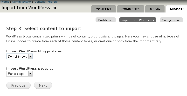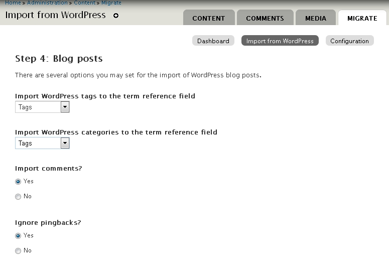 Langkah keempat ialah melakukan konfigurasi hasil import dari wordpress yang berupa Post untuk kategori, tag, komentar, dan konfigurasi lainnya, termasuk alamat url. Setelah itu klik Next Langkah kelima ialah konfigurasi seperti langkah keempat namun untuk Pages. Klik Next untuk melanjutkan. Langkah keenam ialah ringkasan (Review) konfigurasi yang sudah Anda buat. Klik Previous untuk kembali ke halaman sebelumnya, Save import settings jika Anda hanya ingin menyimpan pengaturan, dan Save import settings and run import jika Anda ingin menyimpan pengaturan dan memulai melakukan import. Jika Anda memutuskan untuk Save import settings and run import maka drupal akan memulai migrasi dari wordpress. Lama tidaknya proses tergantung dari banyak tidaknya postingan di wordpress dan tentu saja koneksi internet. Setelah selesai maka Anda akan mendapatkan hasil migrasi tersebut. Silakan buka halaman utama drupal atau Admin > Content untuk melihat hasilnya. Sebagai catatan, Anda dapat menghapus seluruh hasil migrasi ini dan melakukan migrasi ulang sesuai setingan yang sudah Anda lakukan. Selamat Mencoba!