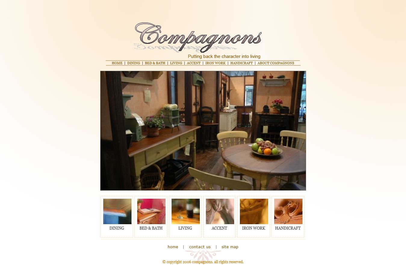 CompagnonsHomeLiving.com menyajikan display produk mebel yang dikerjakan oleh perusahaan Compagnons. Produk yang ditampilkan juga dilengkapi dengan harga dan juga fitur pemesanan dan melacak proses dari pemesanan secara sederhana (shopping cart)